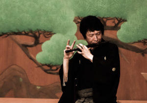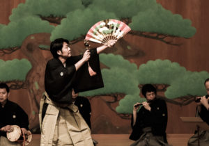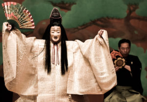 That truth eludes simple description, because it involves a multiplicity of elements. Noh is a music-dance drama, and it’s also valued as literature and for the beauty of its costumes. It takes place as much in the minds of its audience as it does visibly onstage, and its stage is always the same: a plain wooden structure with a painted pine-tree as its backdrop, and with a wooden bridge leading off into the shadows over which the actors enter and exit. That bridge symbolises the passage between the everyday world and the dream world in which Mugen Noh – the art-form’s crowning glory – unfolds. Mugen exists in a dream world populated by ghosts – and many of its stories concern tragic love affairs and the righting of past wrongs in real life; there is much praying for the repose of souls.